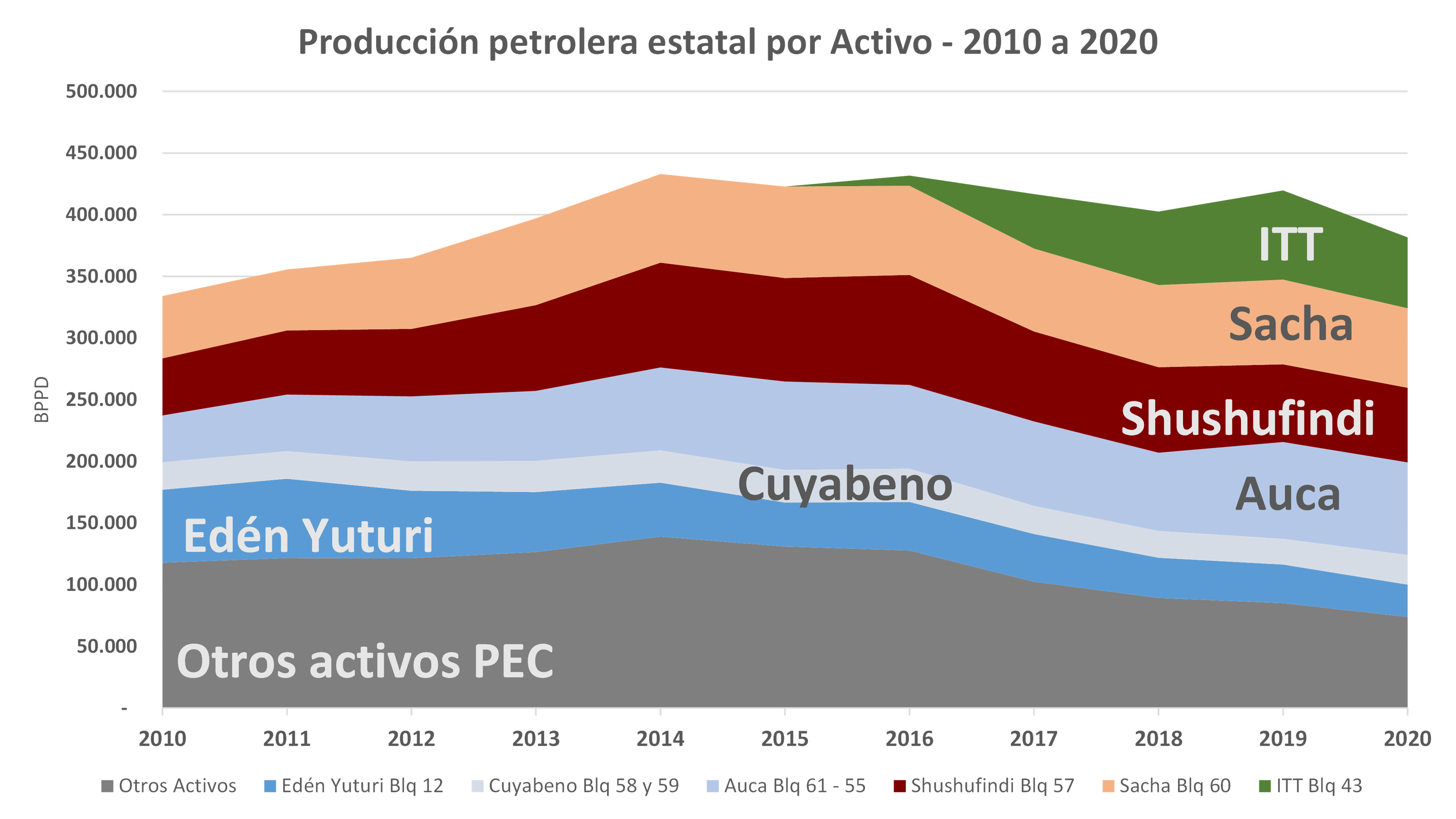 En 2020, los activos Auca, Shushufindi, Sacha, e ITT, aportaron el 67% de la producción total de lo que en ese entonces era Petroamazonas EP (hoy EP Petroecuador). Tres de ellos -Auca, Sacha, y Shushufindi- llevan en producción casi 50 años, por lo que se trata de campos maduros, y cuya producción -salvo que se hagan importantes inversiones- irá disminuyendo en el tiempo. Inclusive en un escenario de altas inversiones, la rentabilidad de estos campos tiende a disminuir porque sus costos de operación se incrementan con el pasar de los años.
