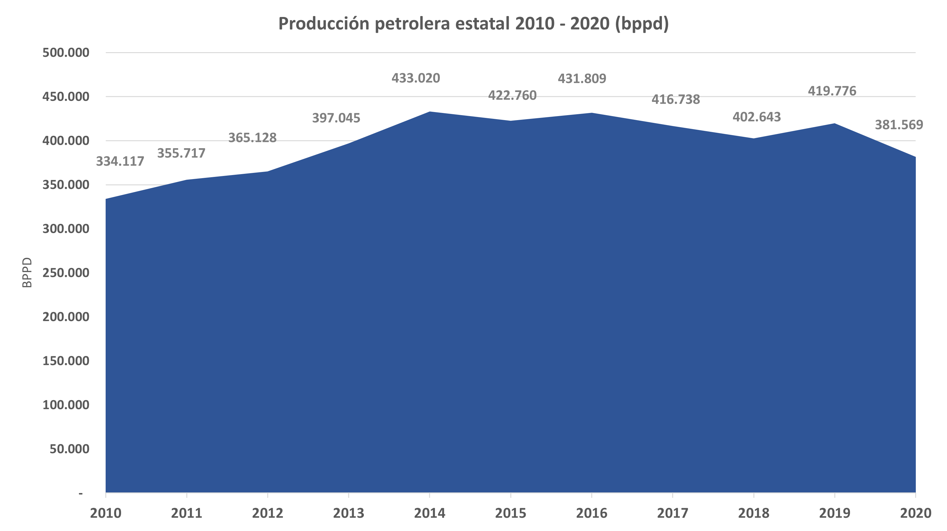 De acuerdo al documento «Petróleo en Cifras 2020«, publicado por la AIHE, la producción estatal de crudo fue la siguiente: